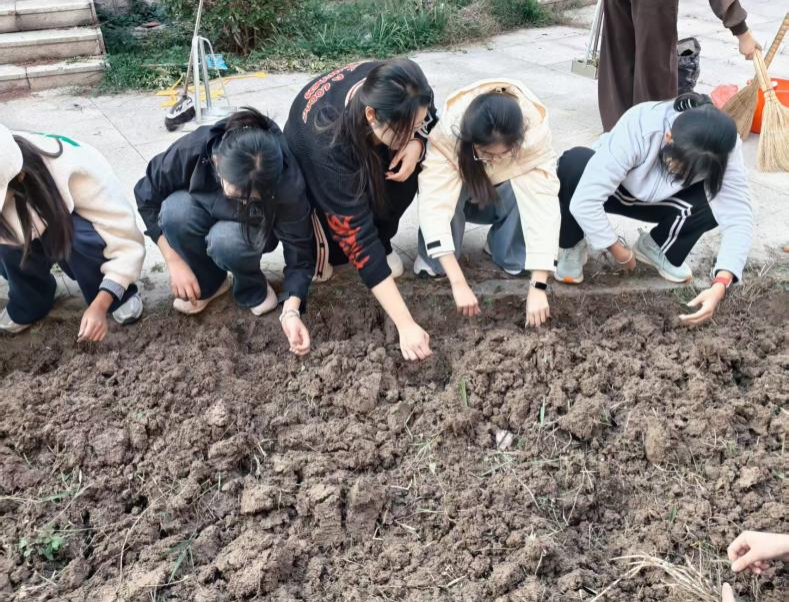 本次活动分两阶段开展。19日,学生们手持镰刀、铁锨、耙子等农具除草、翻地。面对略显板结的土壤,男生主动承担起深翻的重任,挥动铁锨,将沉睡的泥土唤醒。女生则用耙子细心地将大块的土坷垃敲碎、耙平。隔日进行播种,学生各自选择喜欢的植物种子,挖坑、播种、填土、施肥。杂草清理一空,散落的土块也收拾得干干净净,一片松软平整的田地播种下了新的希望。望着共同的劳动成果,大家脸上都洋溢着满足与自豪,纷纷表示期待新生命的萌发。