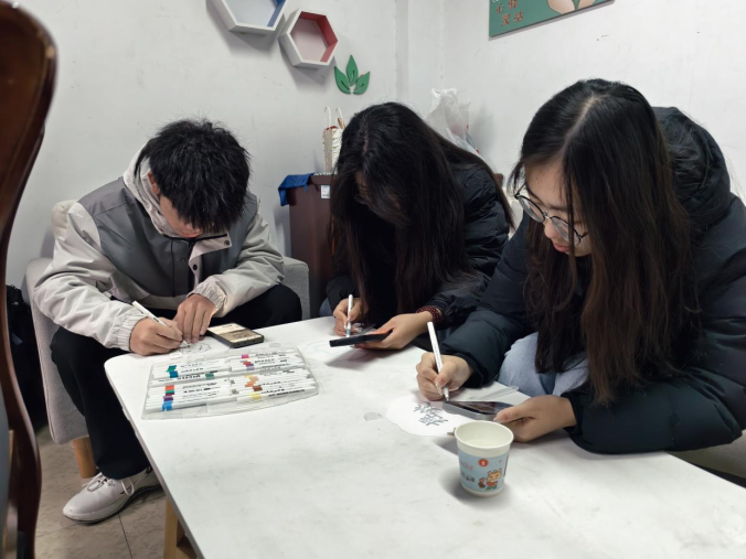 活动现场氛围热烈而温馨,学院为同学们准备了空白团扇、颜料、画笔等创作材料。同学们围绕“青春理想”“校园生活”“家国发展”“心灵治愈”等主题展开创作,有的以绚丽色彩勾勒校园四季美景,有的用细腻线条描绘奋斗青春的场景,还有的通过寓意深刻的图案传递对未来的美好期许。创作过程中,同学们相互交流灵感、分享心得,在一笔一画间释放压力、舒缓情绪,原本空白的扇面逐渐变得鲜活生动,每一把扇子都成为了同学们情感与思想的独特载体。