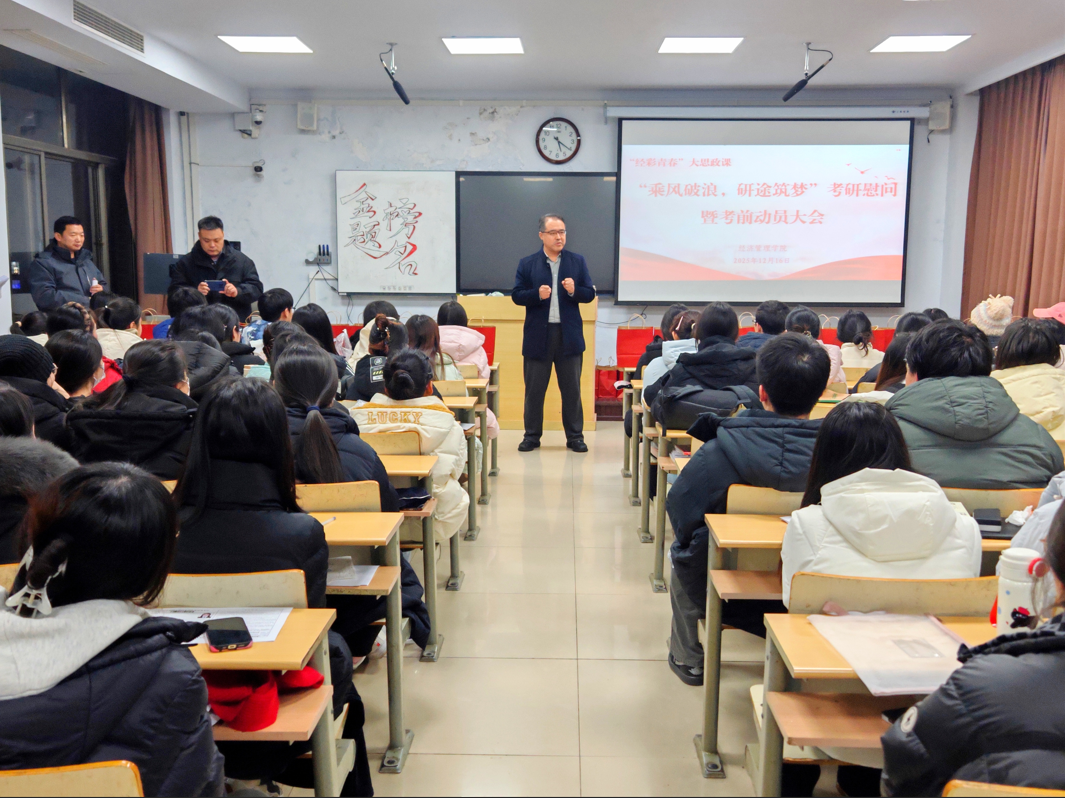 随后,院长王春晖发表动员讲话。他高度肯定了学子们备考路上的坚守与付出,赞扬其不畏艰辛、执着追梦的奋斗精神。王春晖勉励大家,考研既是知识比拼,更是心态较量,希望学子们以“胸有成竹”的自信、“稳扎稳打”的沉着、“全力以赴”的决心迎接挑战,在考场上发挥最佳水平。真挚恳切的话语让在场学子深受触动,化作勇往直前的无形力量。