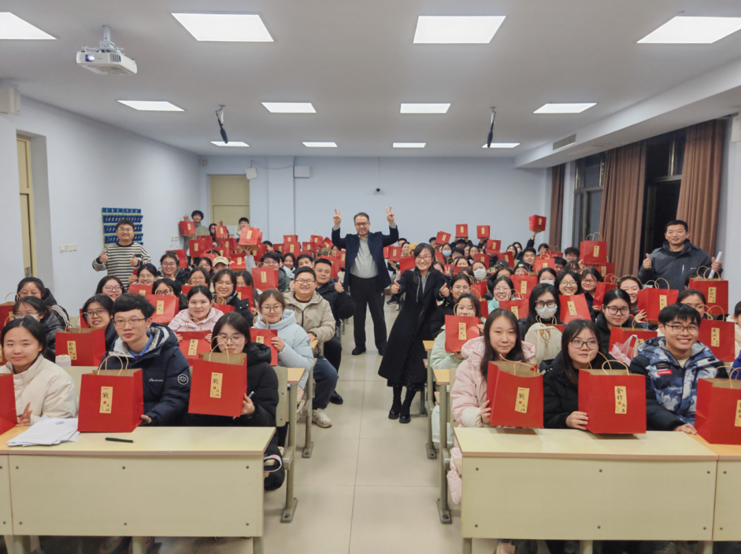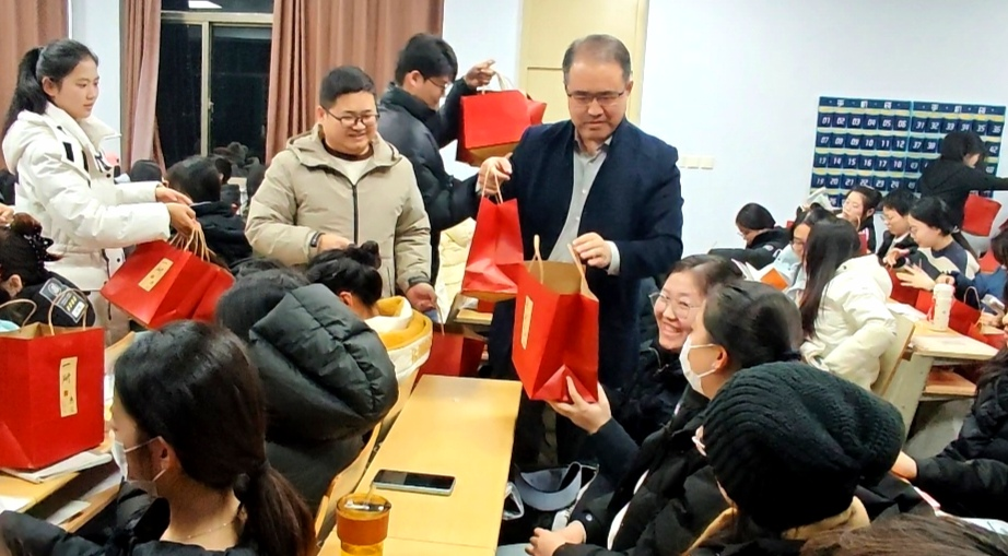 慰问环节,学院领导老师为每位学子逐一发放精心筹备的“考研大礼包”。礼包内藏多重惊喜:寓意“心想事成”的新鲜橙子,寄托着诸事顺遂的美好期许;印刻“愿你笔锋所至,梦想开花”等话语的定制明信片,送上专属幸运祈愿;涵盖签字笔、涂卡笔等的实用文具套装,助力考场落笔从容;香甜零食及时补充体力,便携暖贴驱散凛冬寒意。每一份礼物都承载着浓浓关爱,同学们接过这份沉甸甸的祝福,脸上洋溢着感动与振奋的笑容,纷纷表示这份温暖有效缓解了备考压力,让前进动力愈发充沛。活动尾声,全体考研学子怀着满腔热血,齐声喊出“我们是研究生”的冲刺口号,铿锵有力的呐喊回荡全场,彰显出决战考研的坚定信念与昂扬斗志。随后,领导老师与学子们集体合影留念,定格下这份冬日里的温暖与感动。