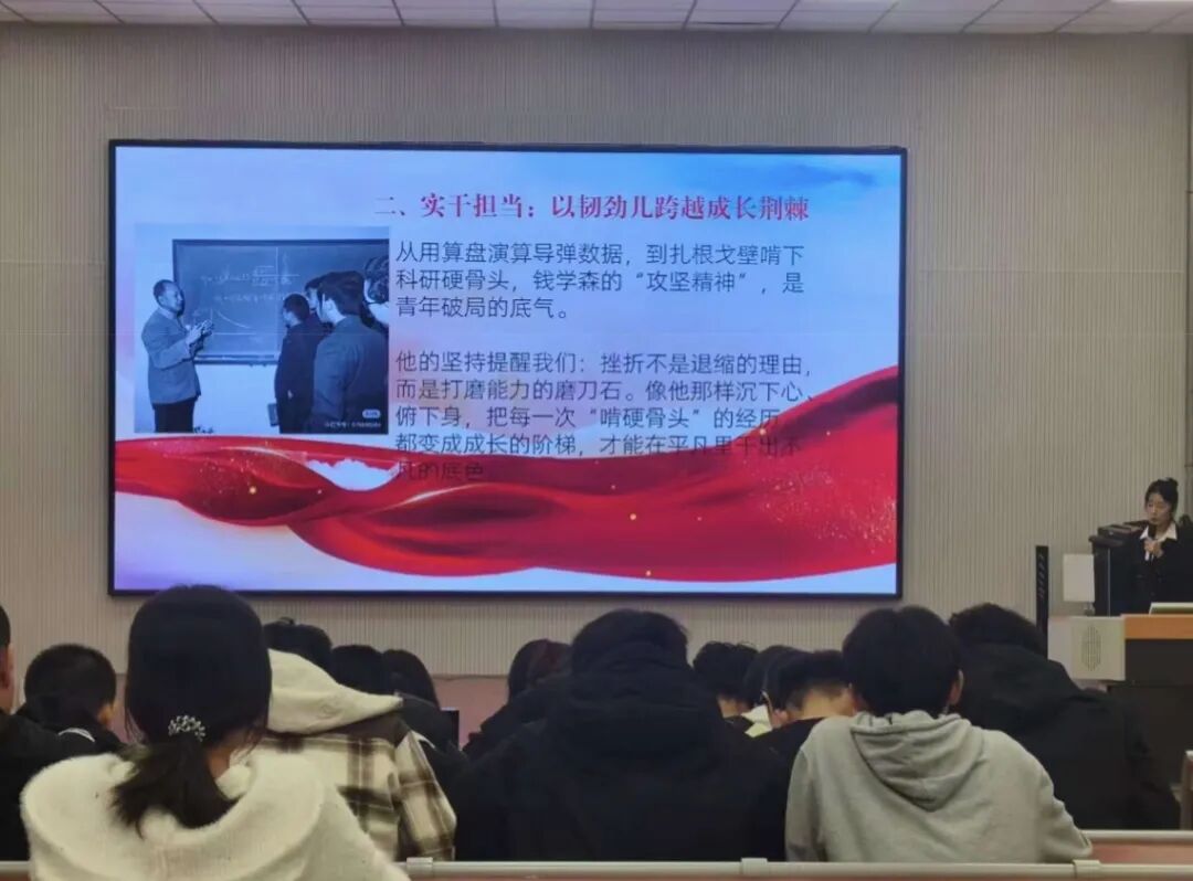 活动现场,学院“经彩青春”宣讲团成员孙梓涵以“赤子丹心赴青春之约”为题,以钱学森先生的奋斗历程为鲜活教材,生动诠释“两弹一星”精神的核心要义:从远赴重洋潜心钻研航天科技,到冲破层层阻挠毅然归国报国;从带领科研团队白手起家、攻坚克难,在荒漠戈壁筑牢我国航天与国防科技根基,到功成名就后坚守初心、心系青年成长。宣讲人用详实的史实、真挚的语言,再现了老一辈科学家“热爱祖国、无私奉献,自力更生、艰苦奋斗,大力协同、勇于登攀”的崇高品格,让同学们在追思中深切感受先辈们为国家富强、民族复兴不惜以身许国的赤子情怀。